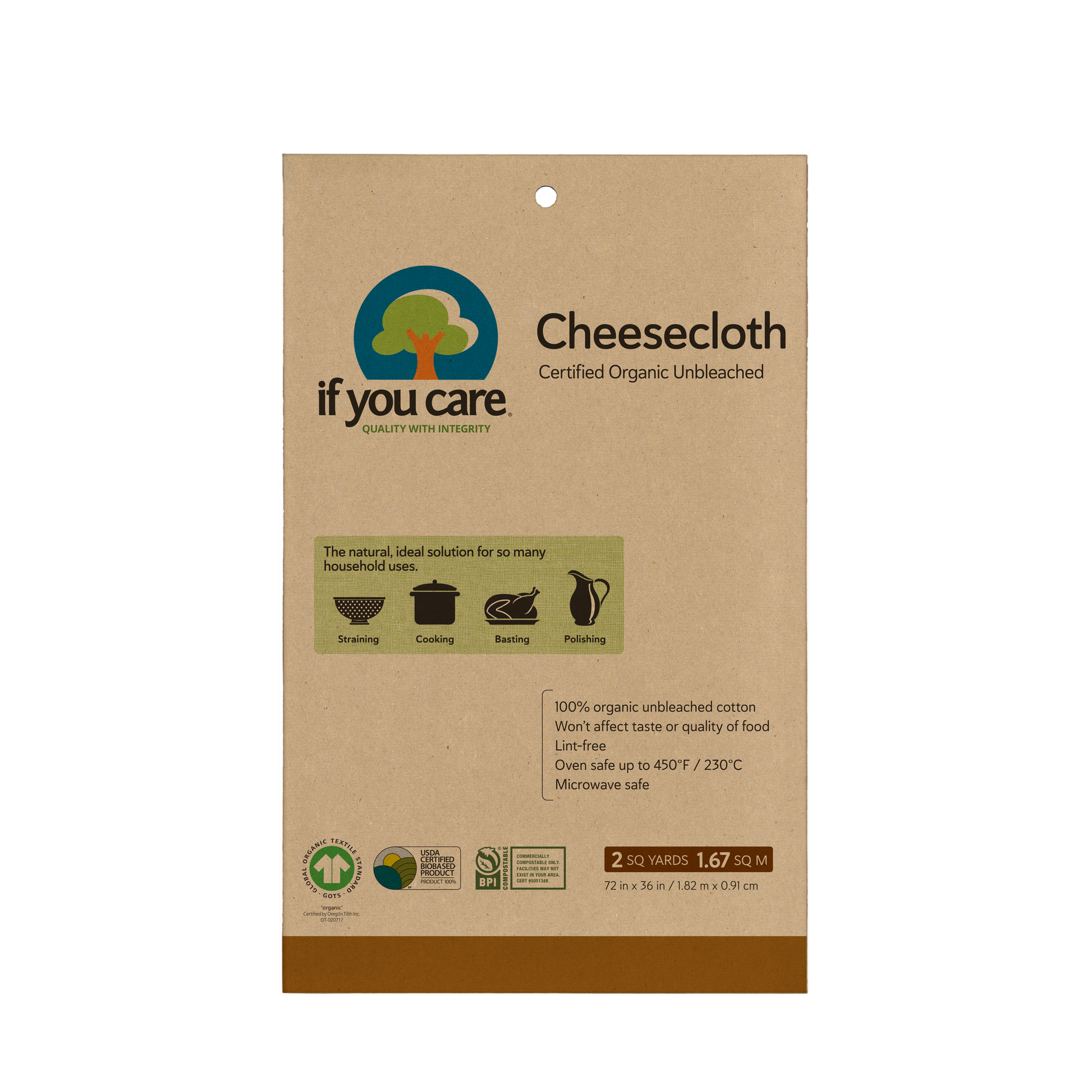 If You Care Cheesecloth is made with GOTS Certified Organic unbleached cotton. It is ideal for cooking, basting, straining and more. It may be boiled and used in microwaves and ovens. It will not affect the taste or safety of your food. It is also good for polishing and other household uses.